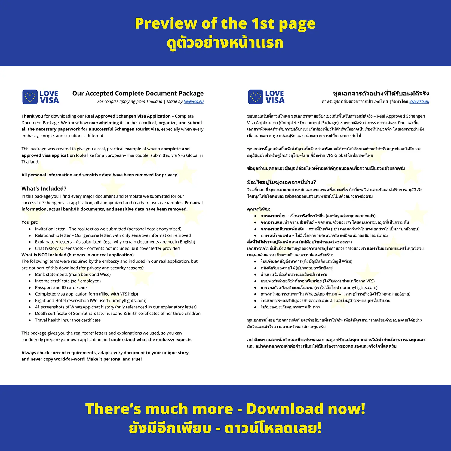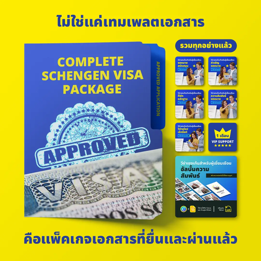 - ชุดเอกสารสมัครวีซ่าเชงเก้นที่ได้รับการอนุมัติจริง (เช็กลิสต์ จดหมายเชิญ จดหมายแสดงความสัมพันธ์ เทมเพลตจดหมายที่พัก และจดหมายสปอนเซอร์)
